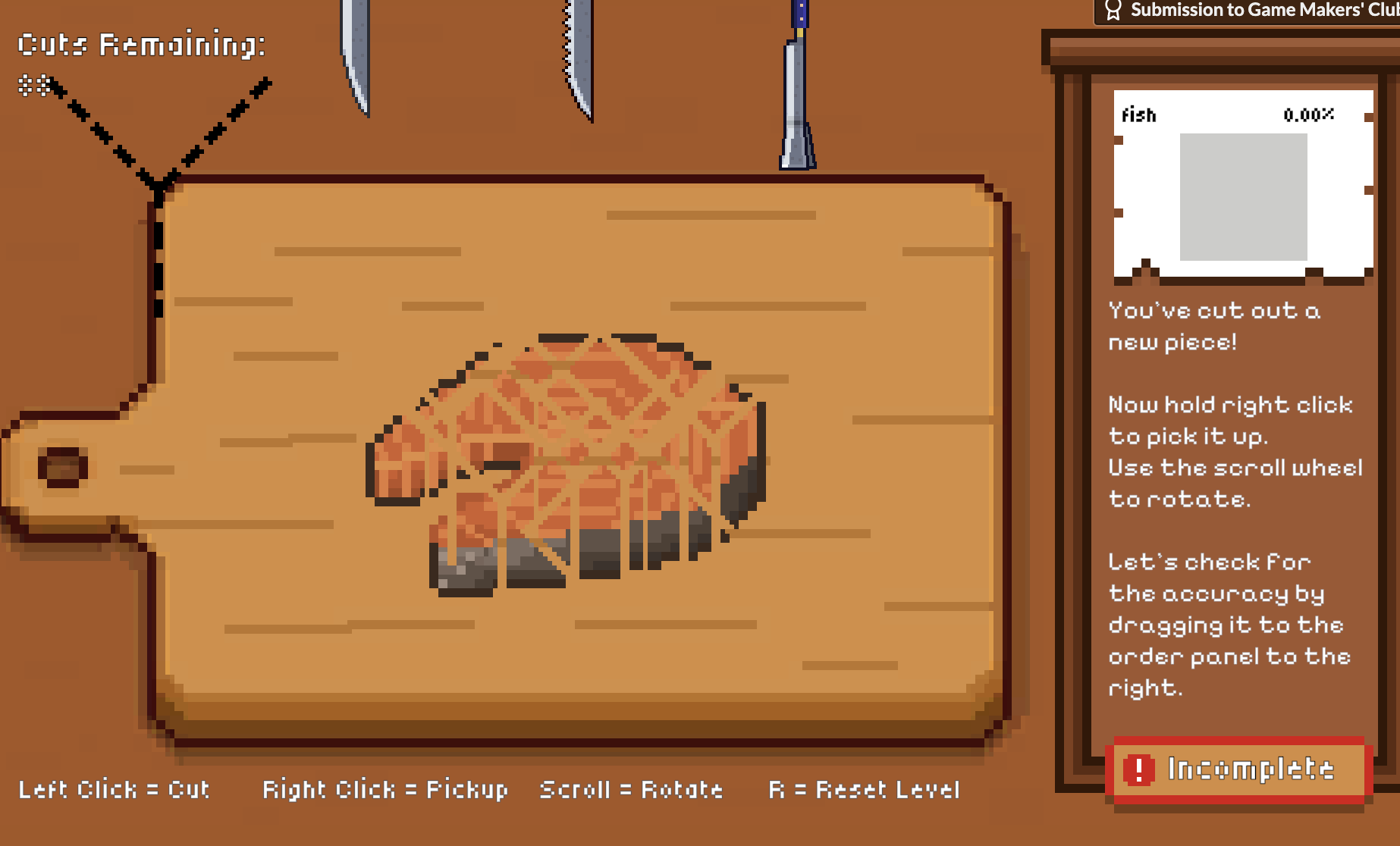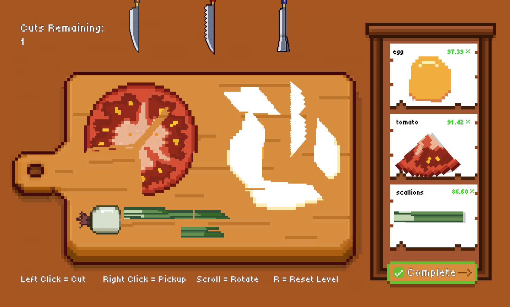 You’ve got a cutting board, a handful of knives, and some very picky customers! 🍳 In this bite-sized puzzler, every slice counts — use your limited knives to carve ingredients into just the right shape to match each order. 🔪🔪 Can you serve up perfection before you run out of chops? 🥩🥩🥩